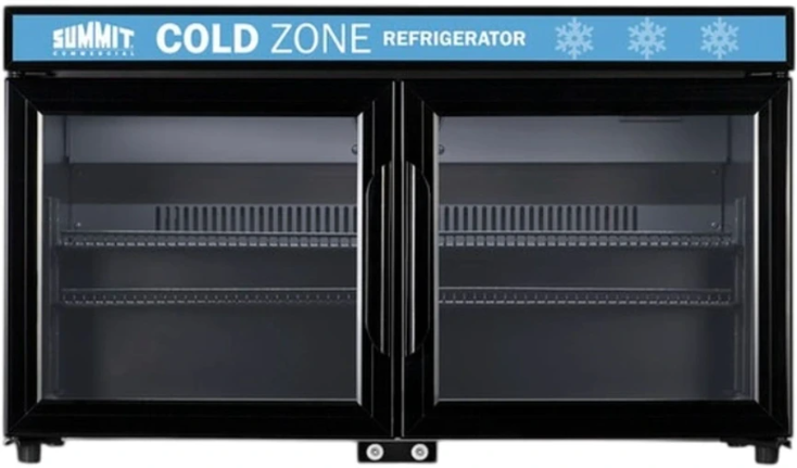 The SCR3502DLL is a 17.5" shallow depth single-zone beverage refrigerator with a 36" width, making it ideal for countertops and use on or in shelves (with proper ventilation). It is SGS-listed to NSF-7 standards for use in commercial settings and is designed for freestanding use. Its French door swing with two glass doors offers a full view inside the 3.2 cu.ft. interior, while pre-installed curved, sturdy black handles make for easy opening of the unit. Both doors have a self-closing feature to help protect stored items in commercial settings where customers may not take the time to ensure a tight seal. Factory-installed locks offer additional security. The fully-finished black cabinet suits any setting, with a sealed back for easier cleaning. Four leveling legs keep the unit level on uneven surfaces.