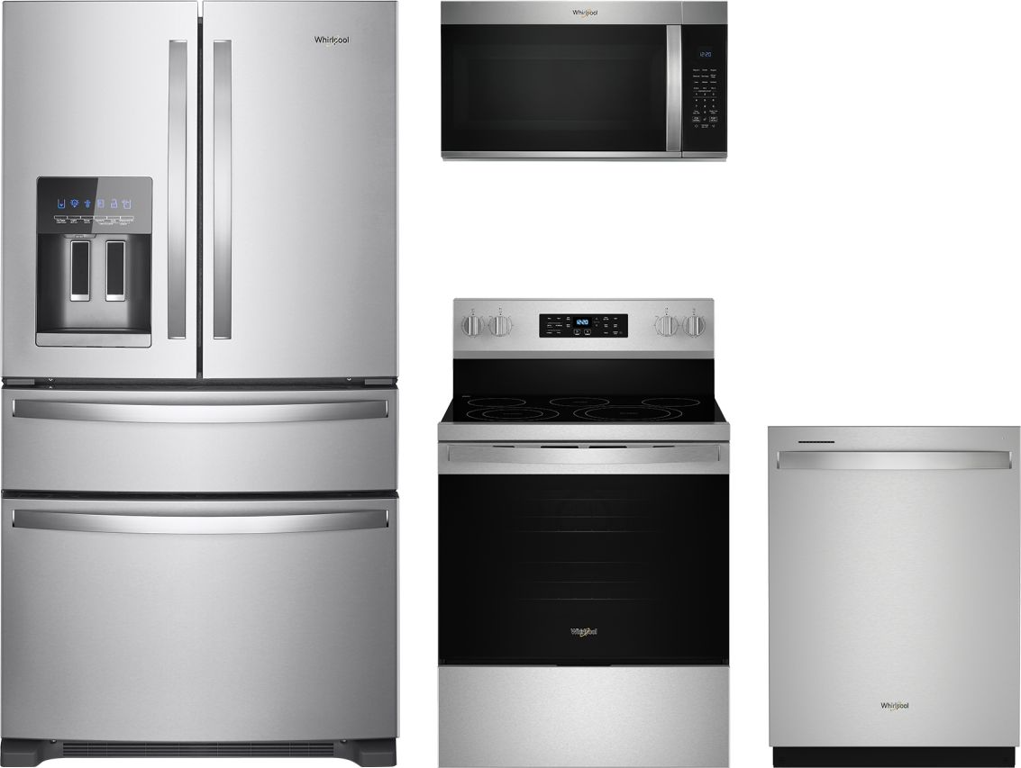 Whirlpool® 4 Piece Fingerprint Resistant Stainless Steel Kitchen Package with french door refrigerator, free standing electric range, over the range microwave, and built in dishwasherRead More