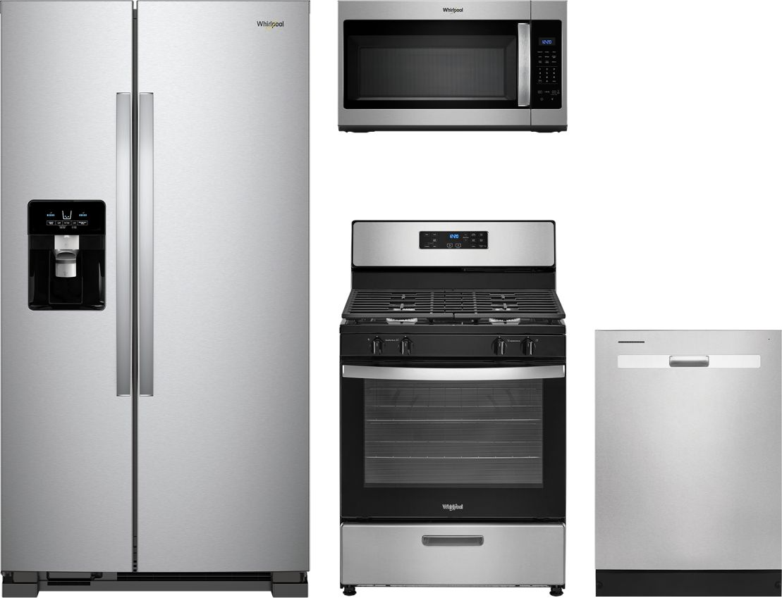 Whirlpool® 4 Piece Stainless Steel Kitchen Package with side-by-side refrigerator, freestanding gas range, built in dishwasher and over the range microwave.Read More