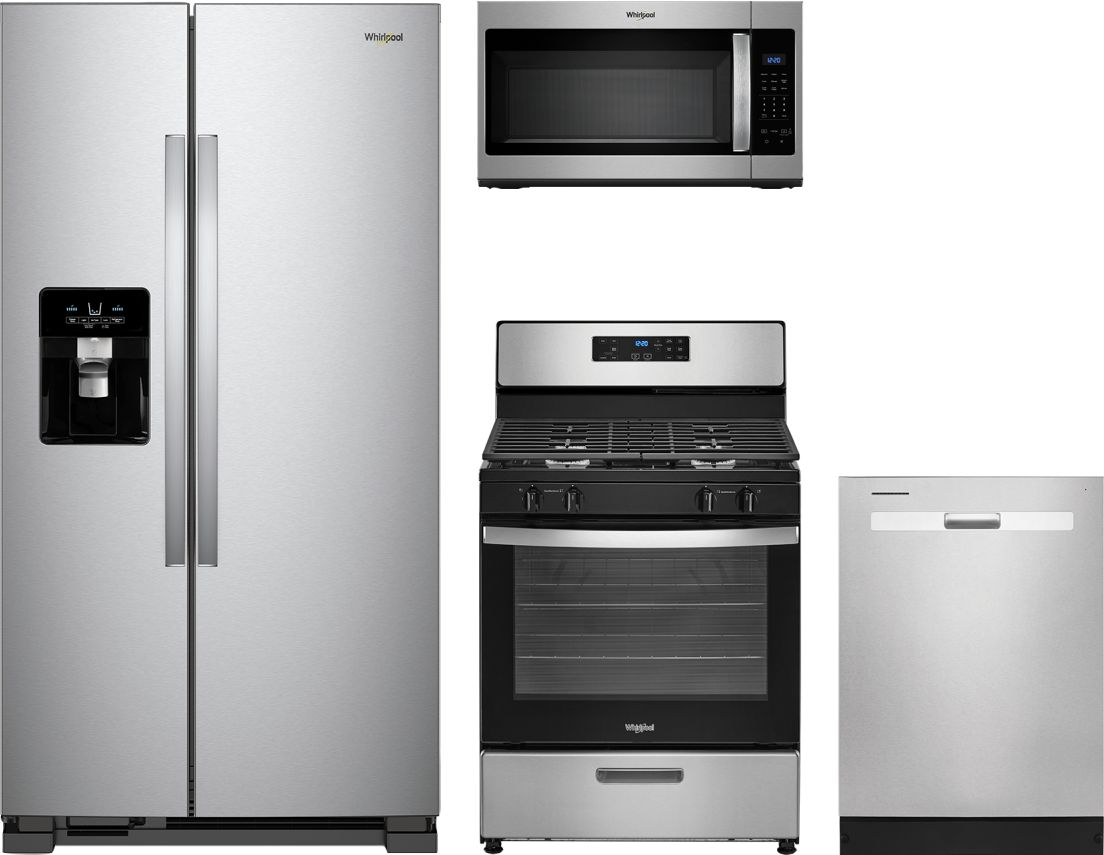 Whirlpool® 4 Piece Stainless Steel Kitchen Package with side-by-side refrigerator, freestanding gas range, built in dishwasher and over the range microwave.Read More