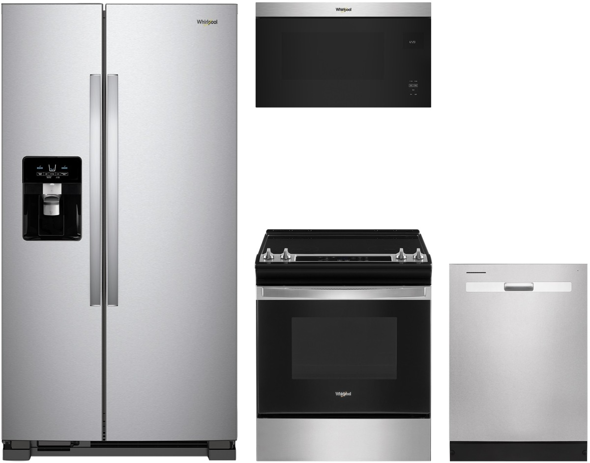 Whirlpool® 4 Piece Stainless Steel Kitchen Package with side-by-side refrigerator, freestanding electric range, built in dishwasher and over the range microwave.Read More