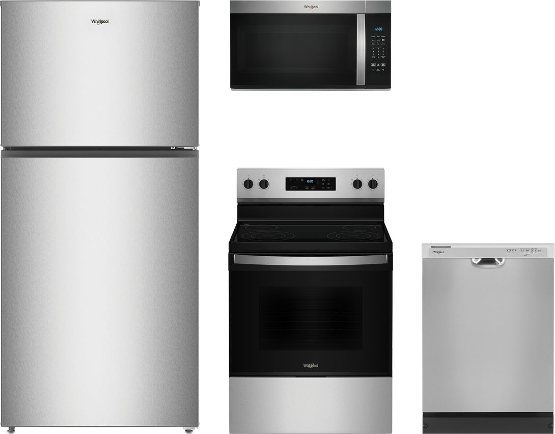 Whirlpool® 4 Piece Stainless Steel Kitchen Package with, top freezer refrigerator, front control built-in dishwasher, freestanding electric range, and over the range microwave.Read More