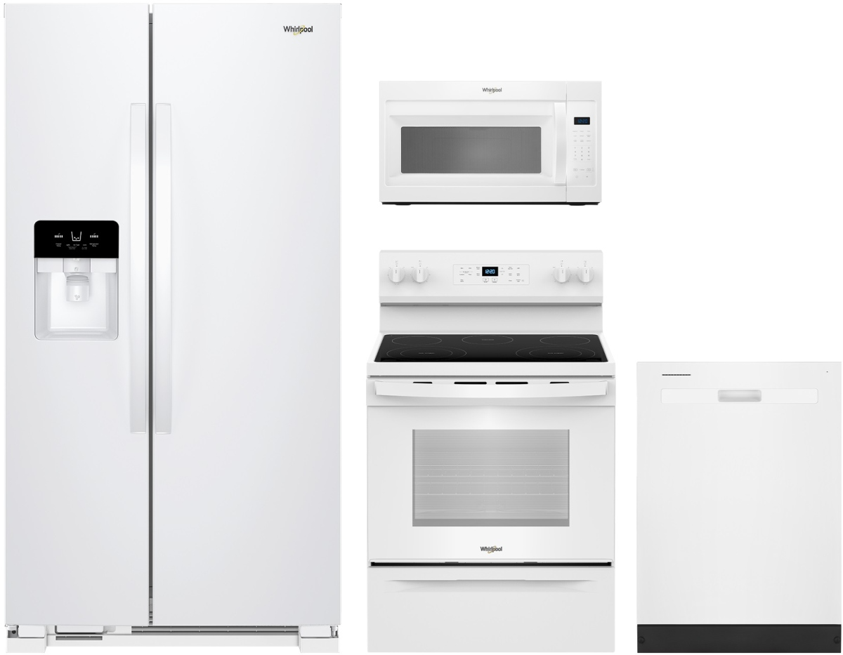 Whirlpool® 4 Piece White Kitchen Package with side-by-side refrigerator, freestanding electric range, built in dishwasher and over the range microwave.Read More